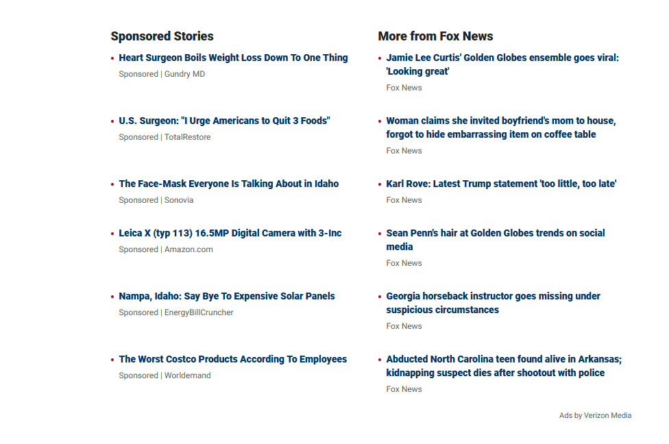 This is an example of native advertising found on the Fox News website. You usually see native ads like these at the end of an article. They don’t disturb your experience on the site, they’re clearly labeled as sponsored content, and they aren’t showcasing products for sale. These native ads have headlines crafted to pique your curiosity and get you to click through to the sponsored brand’s website.